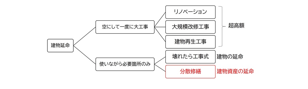 分散修繕は、「•使いながら必要箇所のみ」式の建物延命法ですが、「壊れたら工事式」が、物の建物の延命方法に過ぎないのに対して、分散修繕は、建物資産の延命の方法です。