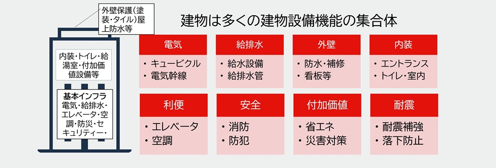 建物は「物」だ。時に箱物と呼ばれるが、実は箱では価値が無い。実際には躯体と建物設備機能等という様々な物の集合体だ。人間が、骨や血管や多くの臓器の集合体として生きているのと同じだ。